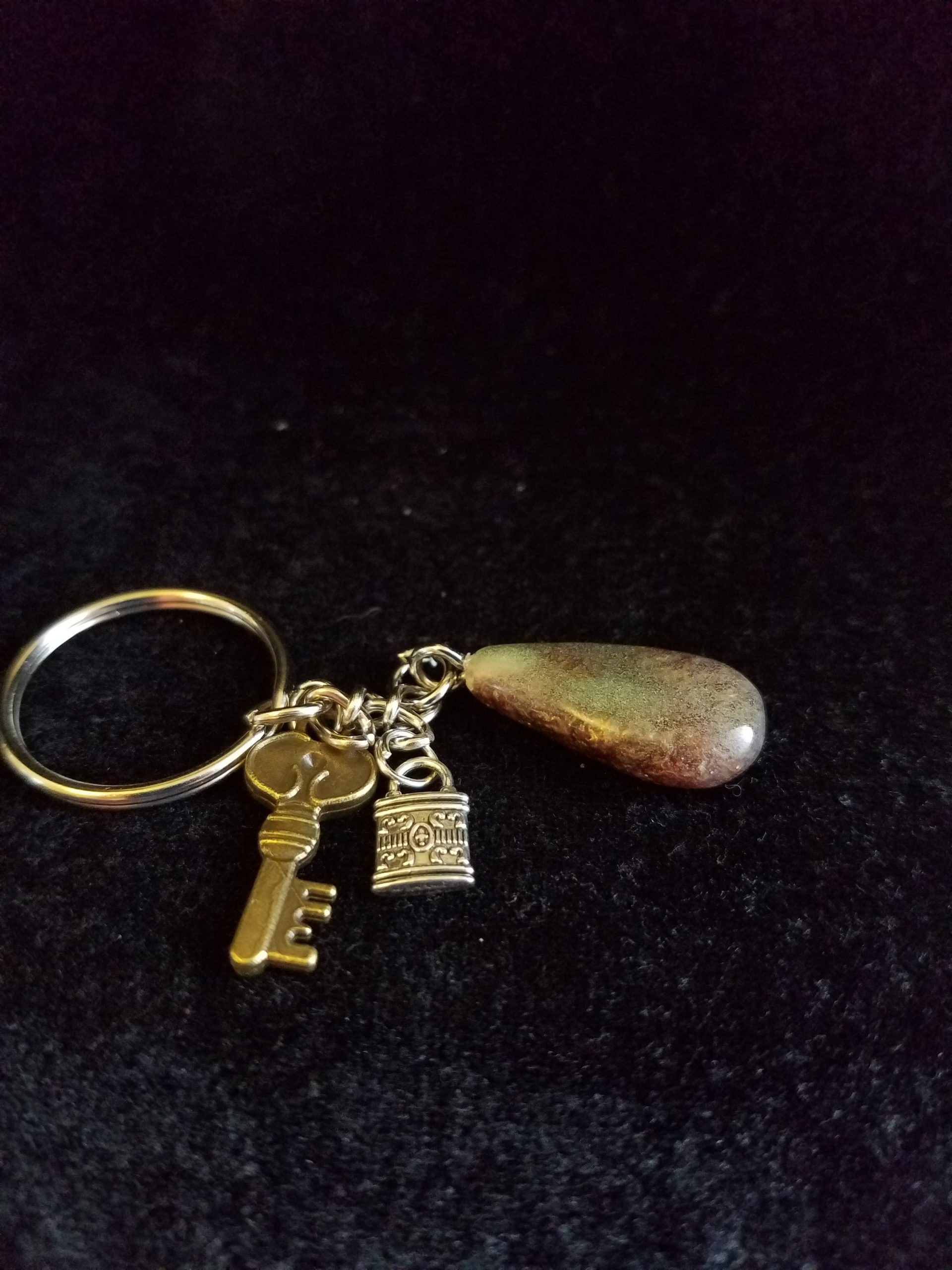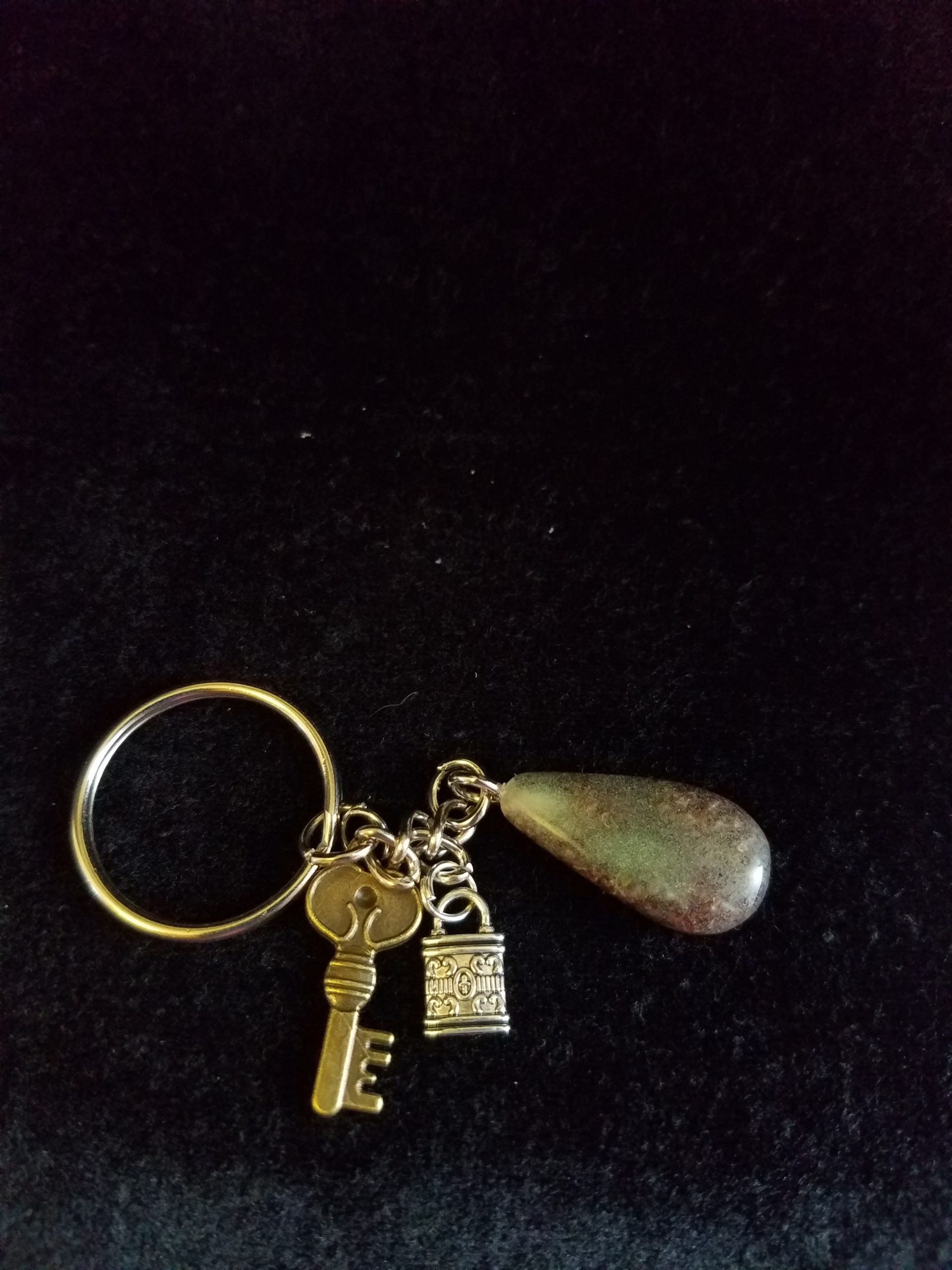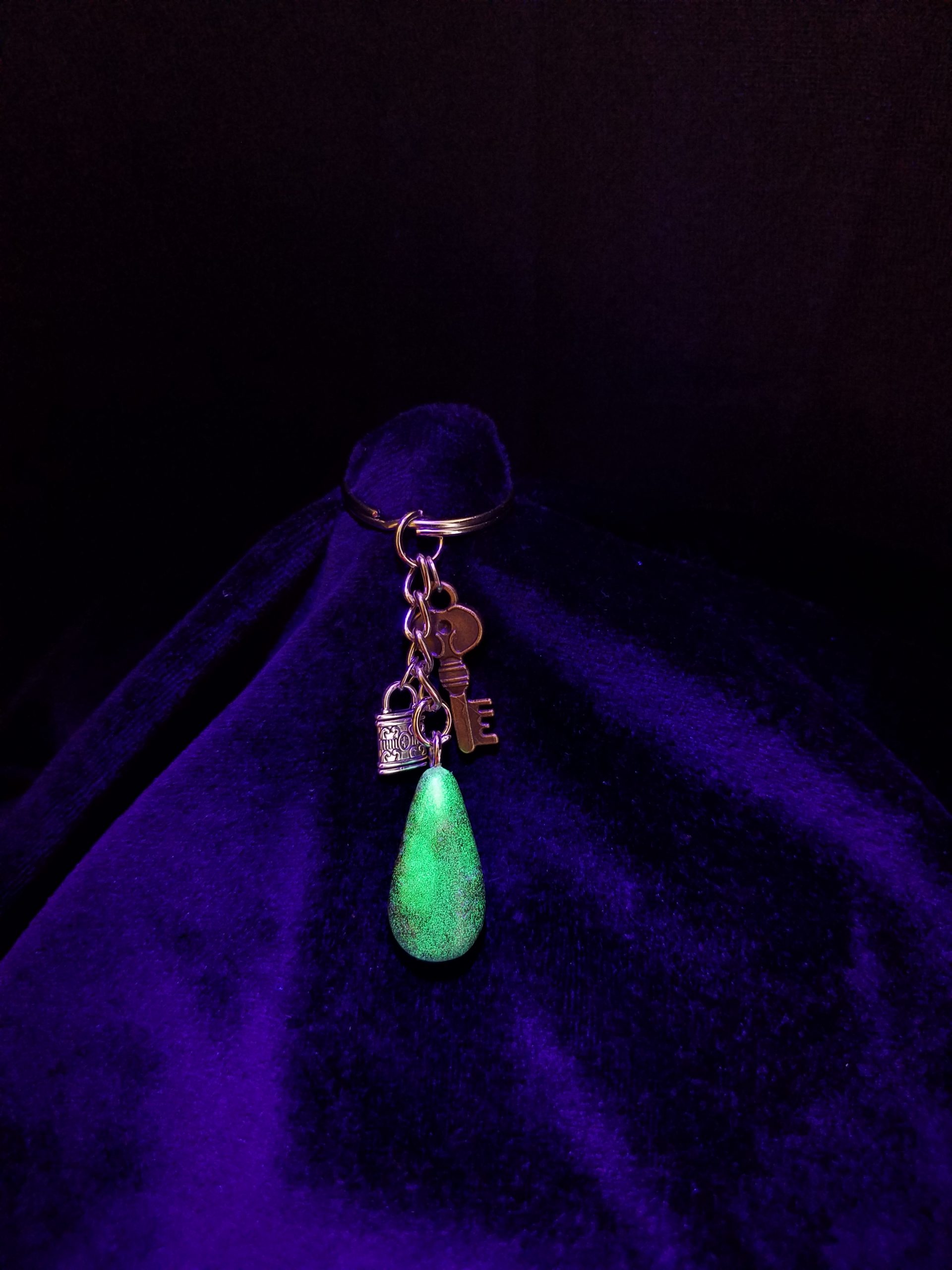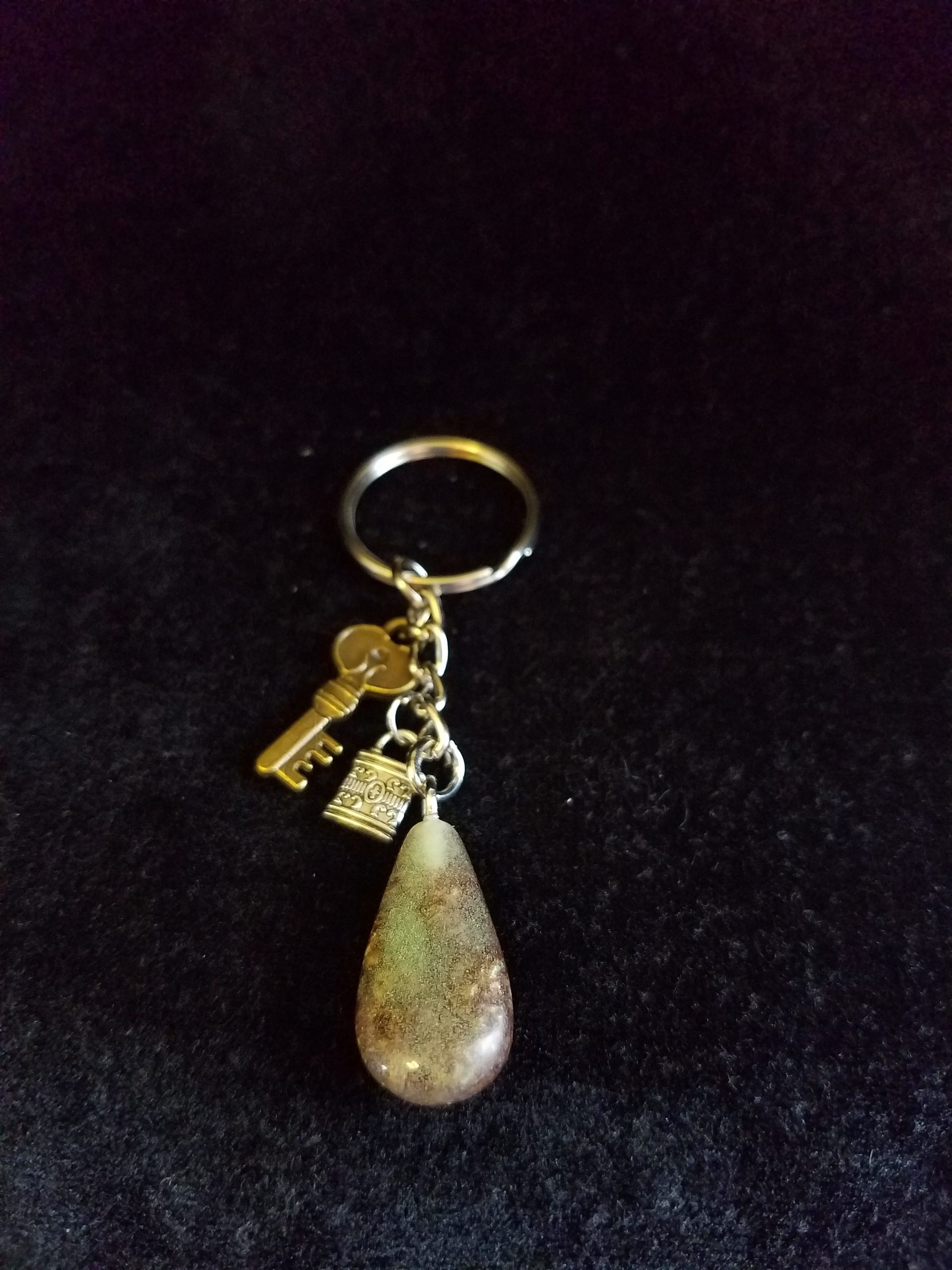 - A 3 1/4″ long abstract silver keychain with a 1 1/4″ x 1/2″ green glow and brown epoxy teardrop keychain and a 1/2″ x 1/4″ silver lock charm and a 1″ x 1/2″ bronze key charm.