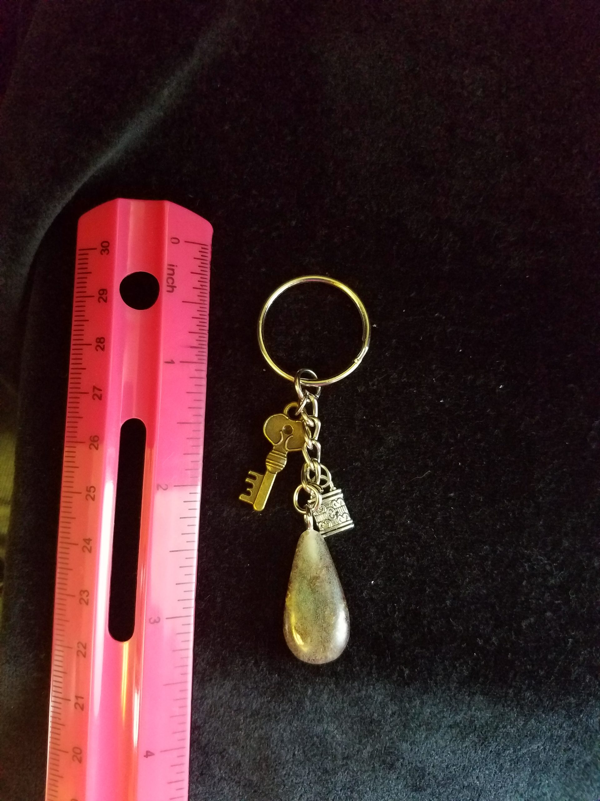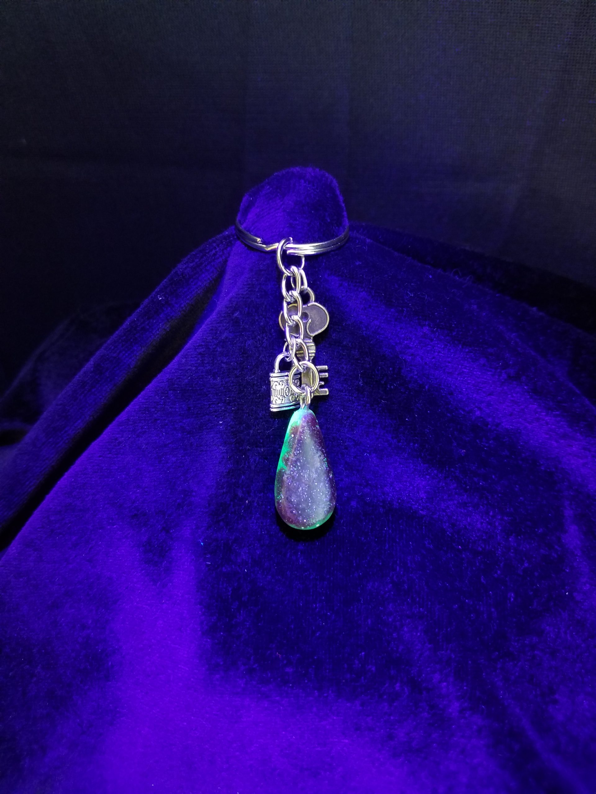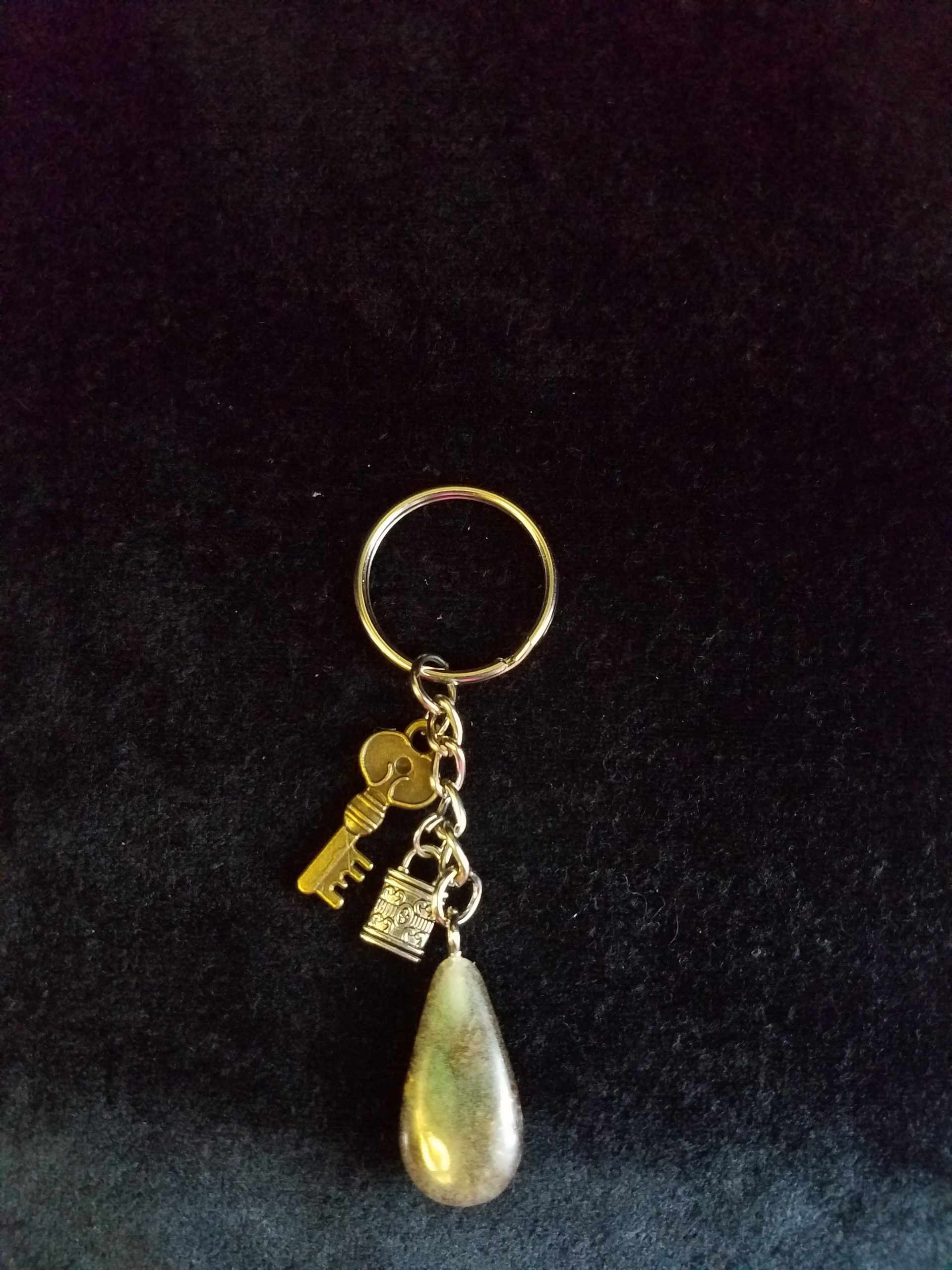 - A 3 1/4″ long abstract silver keychain with a 1 1/4″ x 1/2″ green glow and brown epoxy teardrop keychain and a 1/2″ x 1/4″ silver lock charm and a 1″ x 1/2″ bronze key charm.