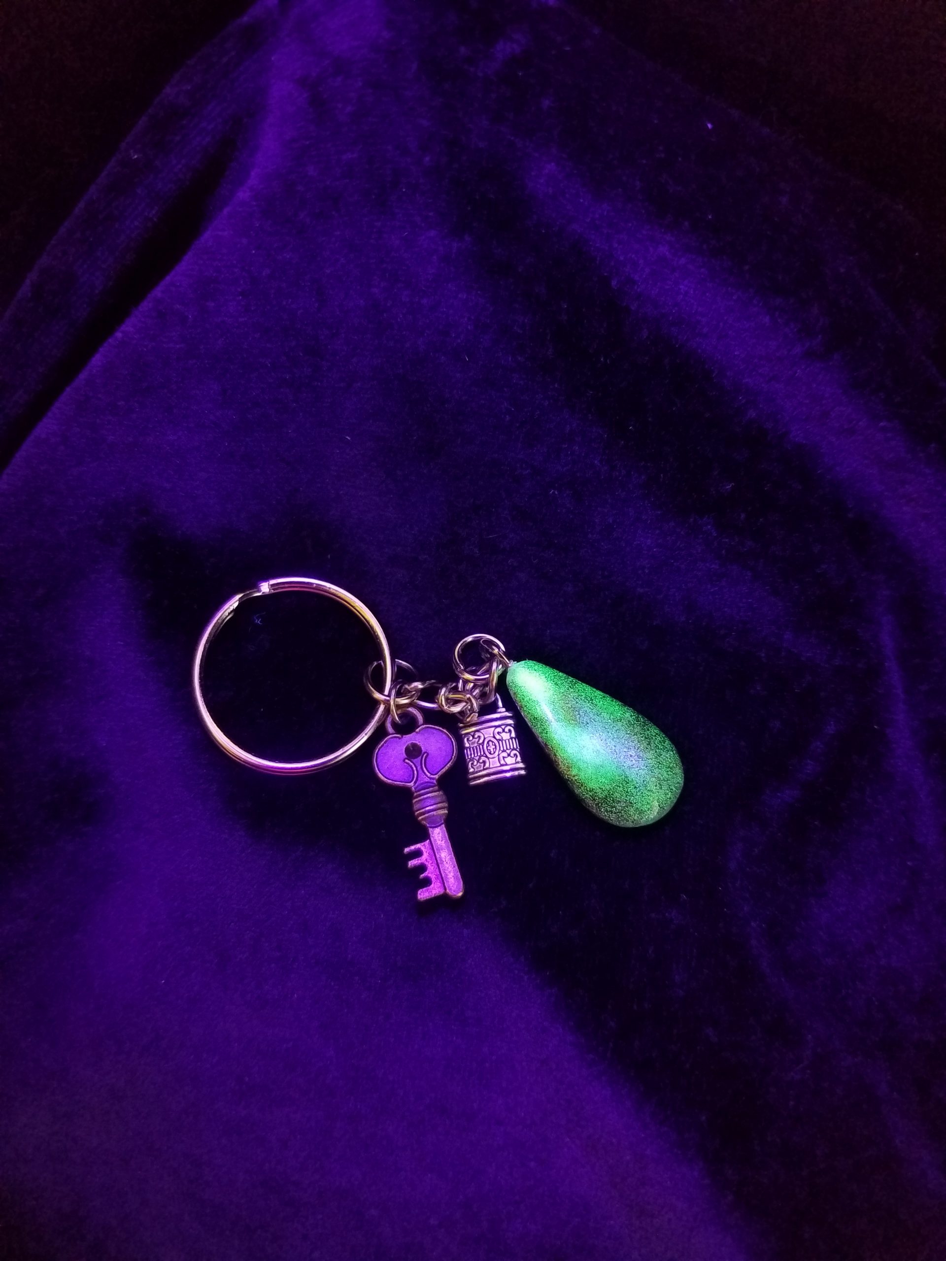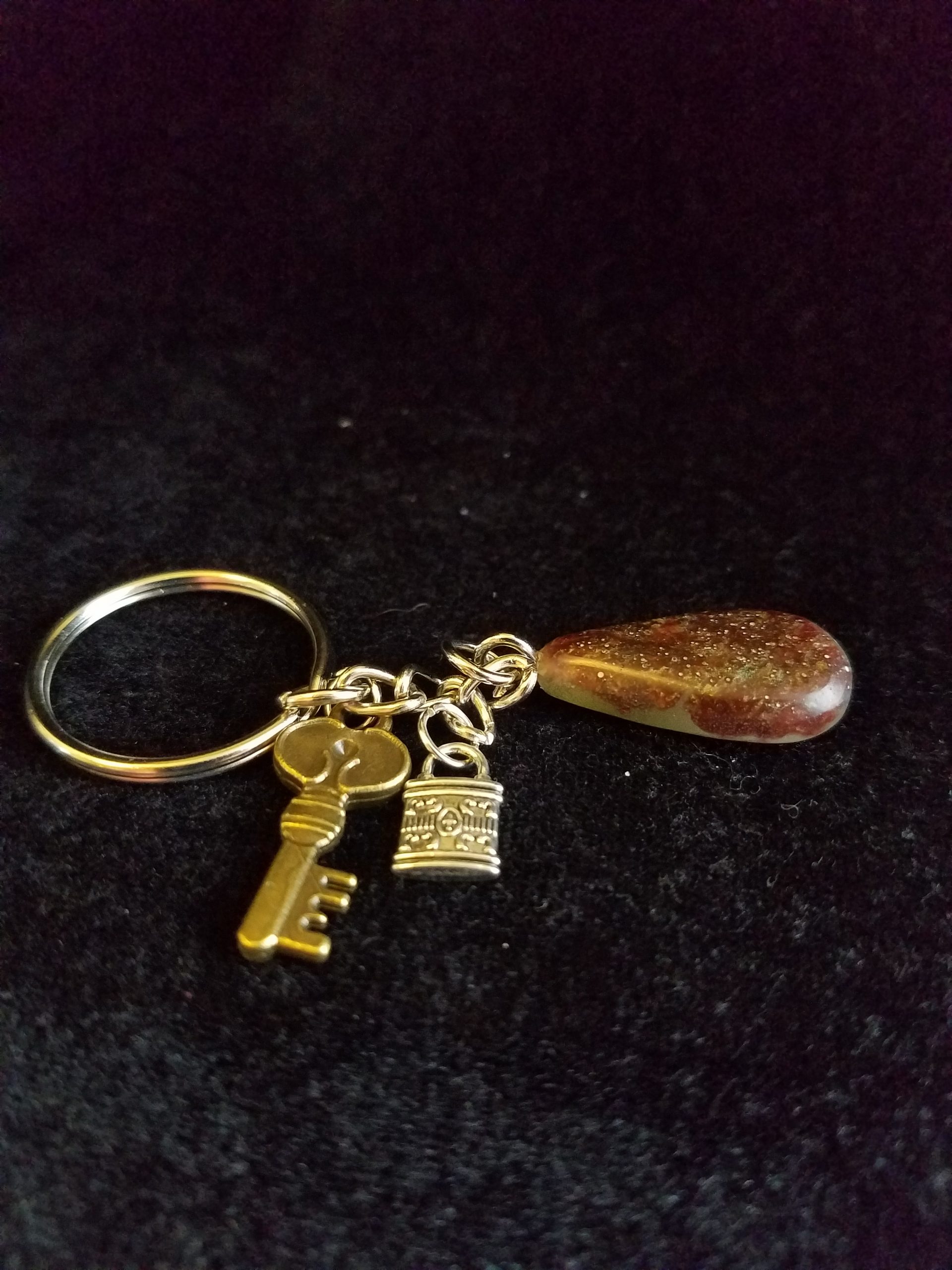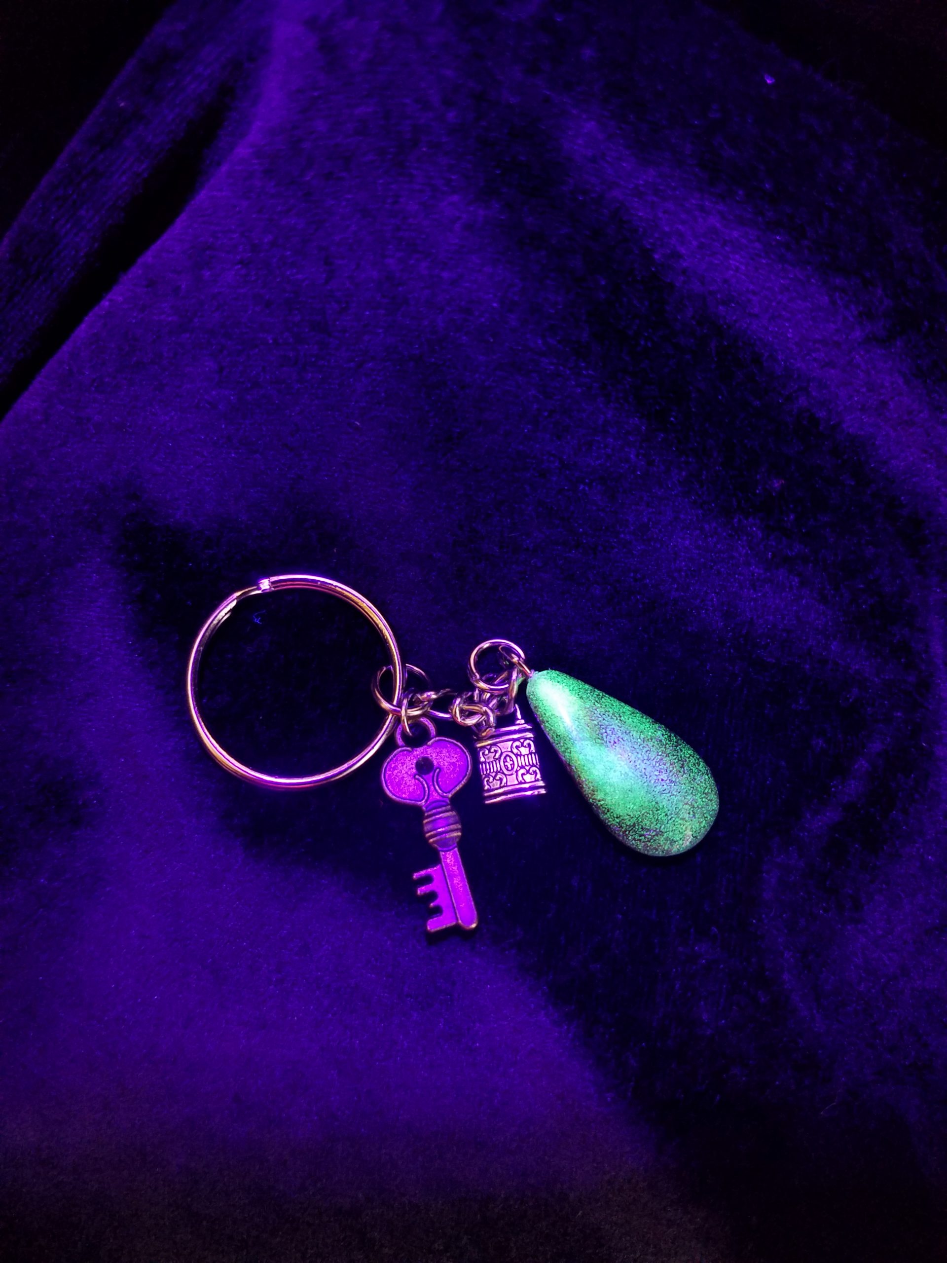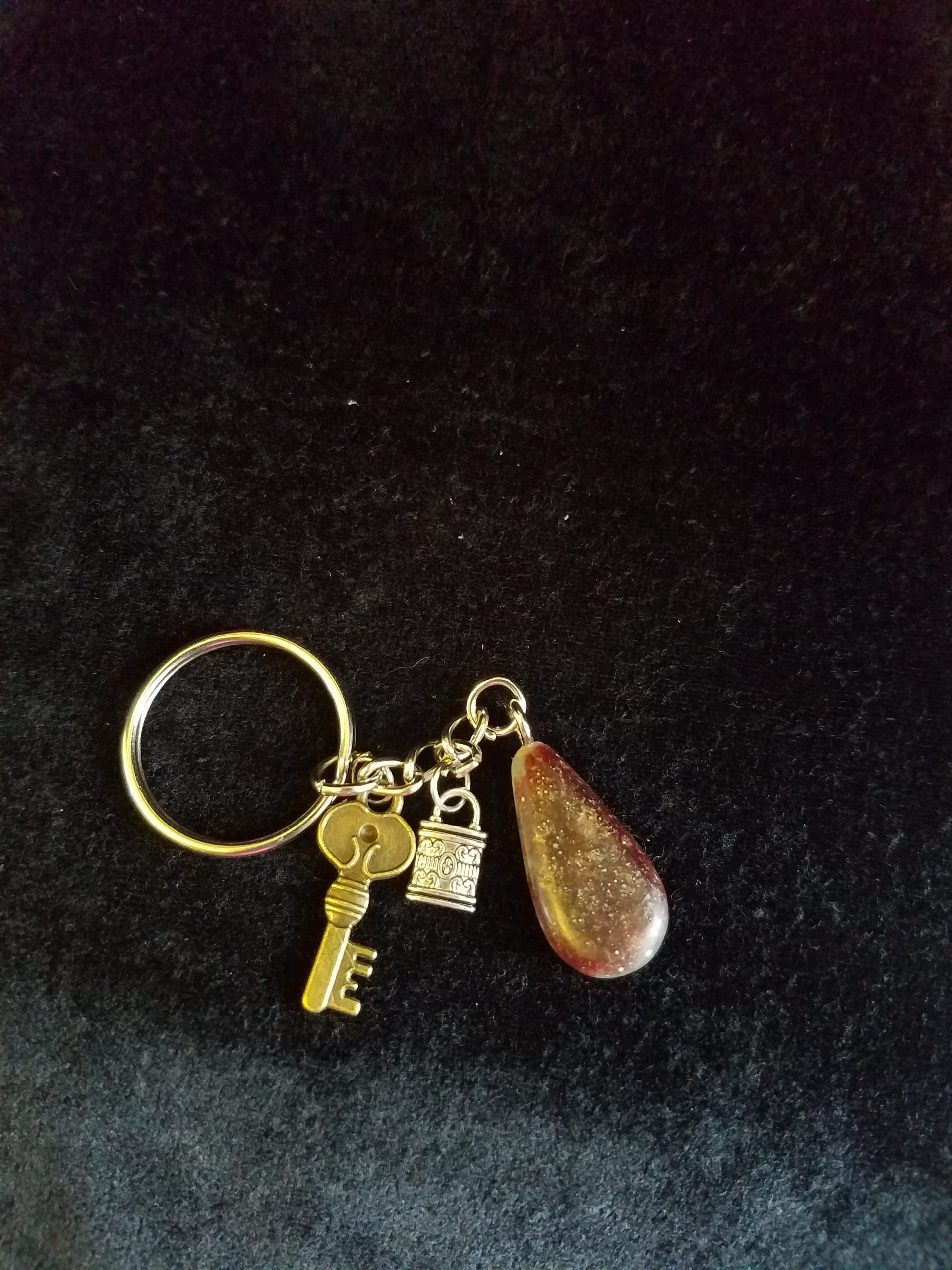 - A 3 1/4″ long abstract silver keychain with a 1 1/4″ x 1/2″ green glow and brown epoxy teardrop keychain and a 1/2″ x 1/4″ silver lock charm and a 1″ x 1/2″ bronze key charm.