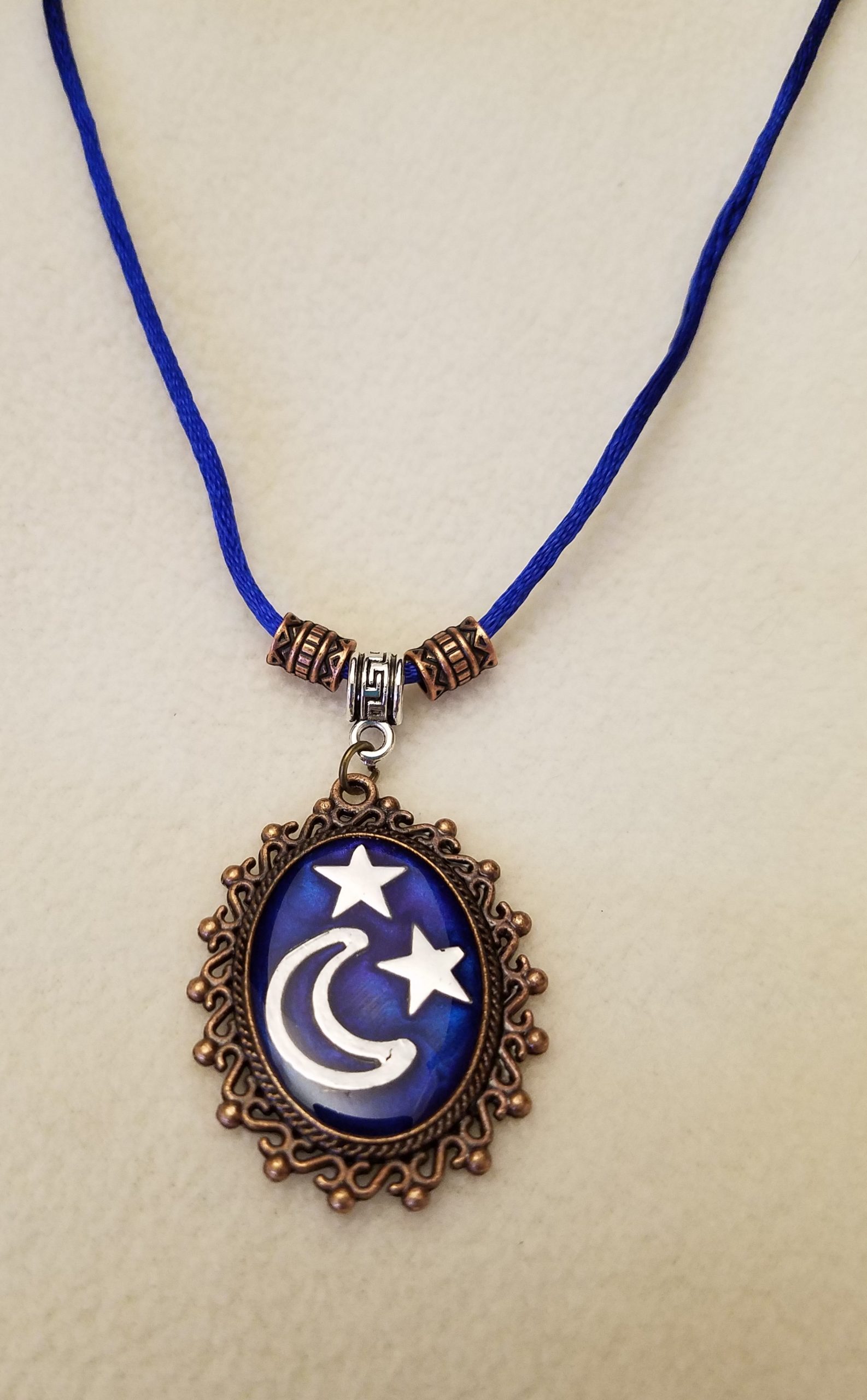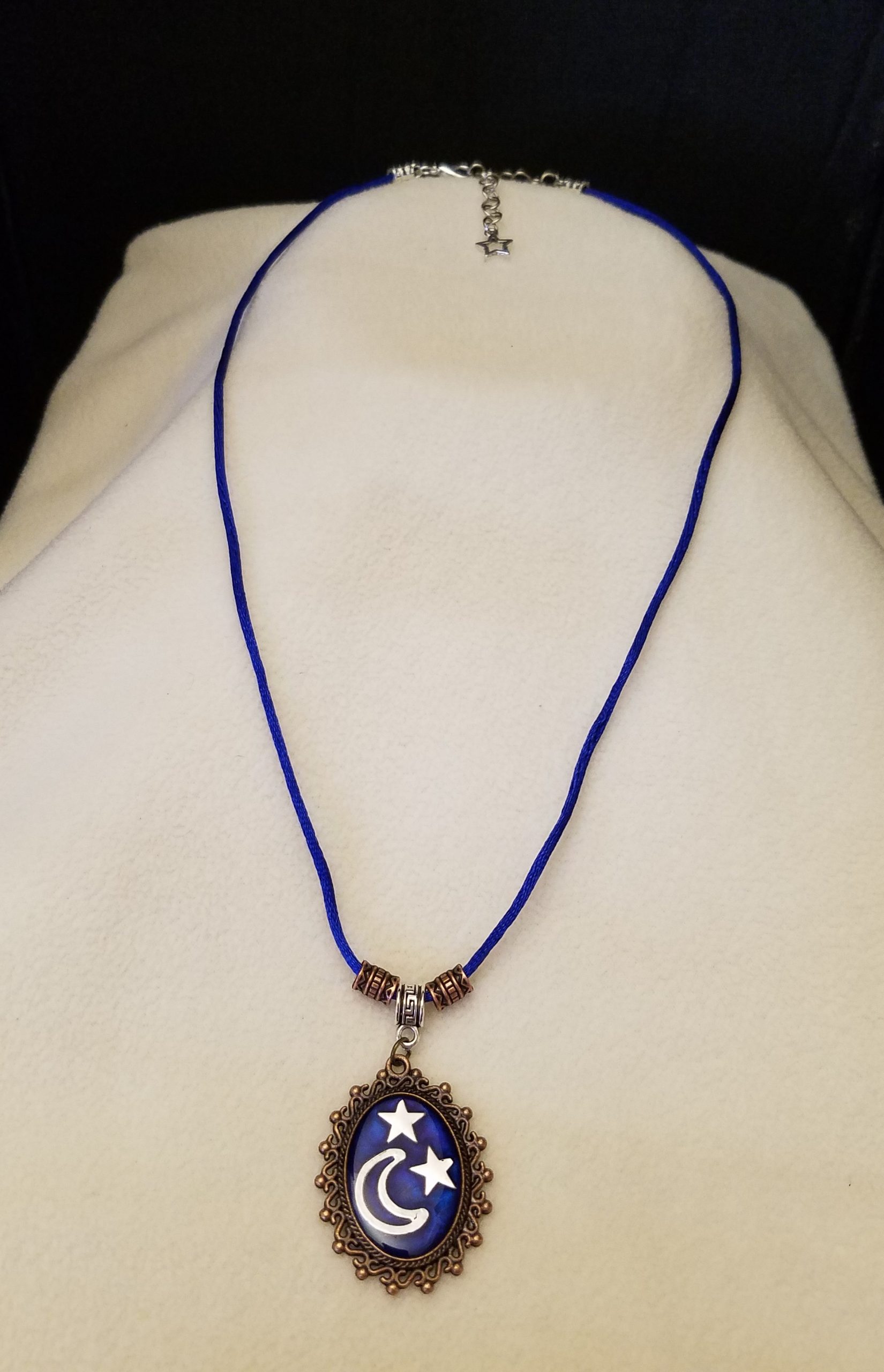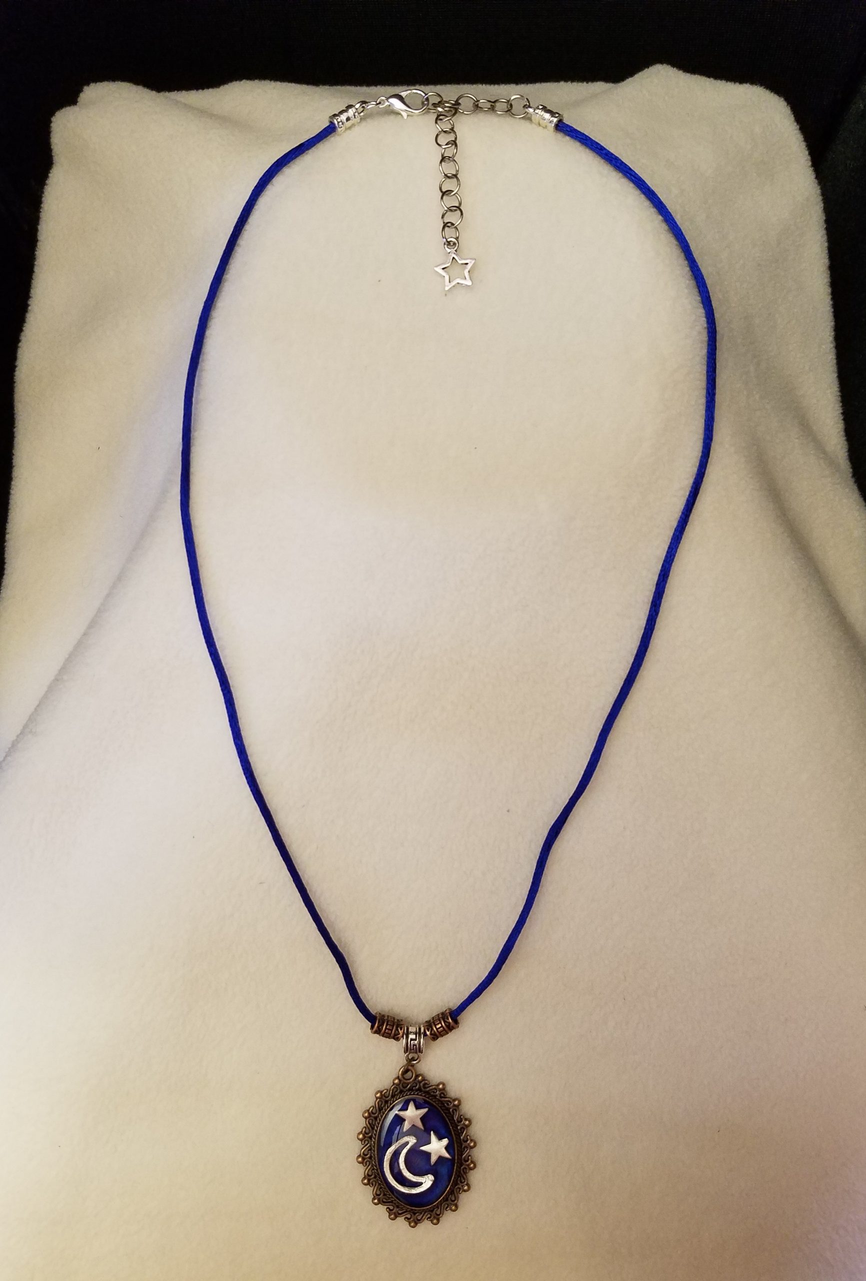 - A 20 1/2″ – 23″ blue cord necklace with bronze beads, a silver chain adjustment with a star counterweight and 1 1/2″ x 1 1/4″ decorative bronze pendant with silver moon and stars set in deep blue epoxy.