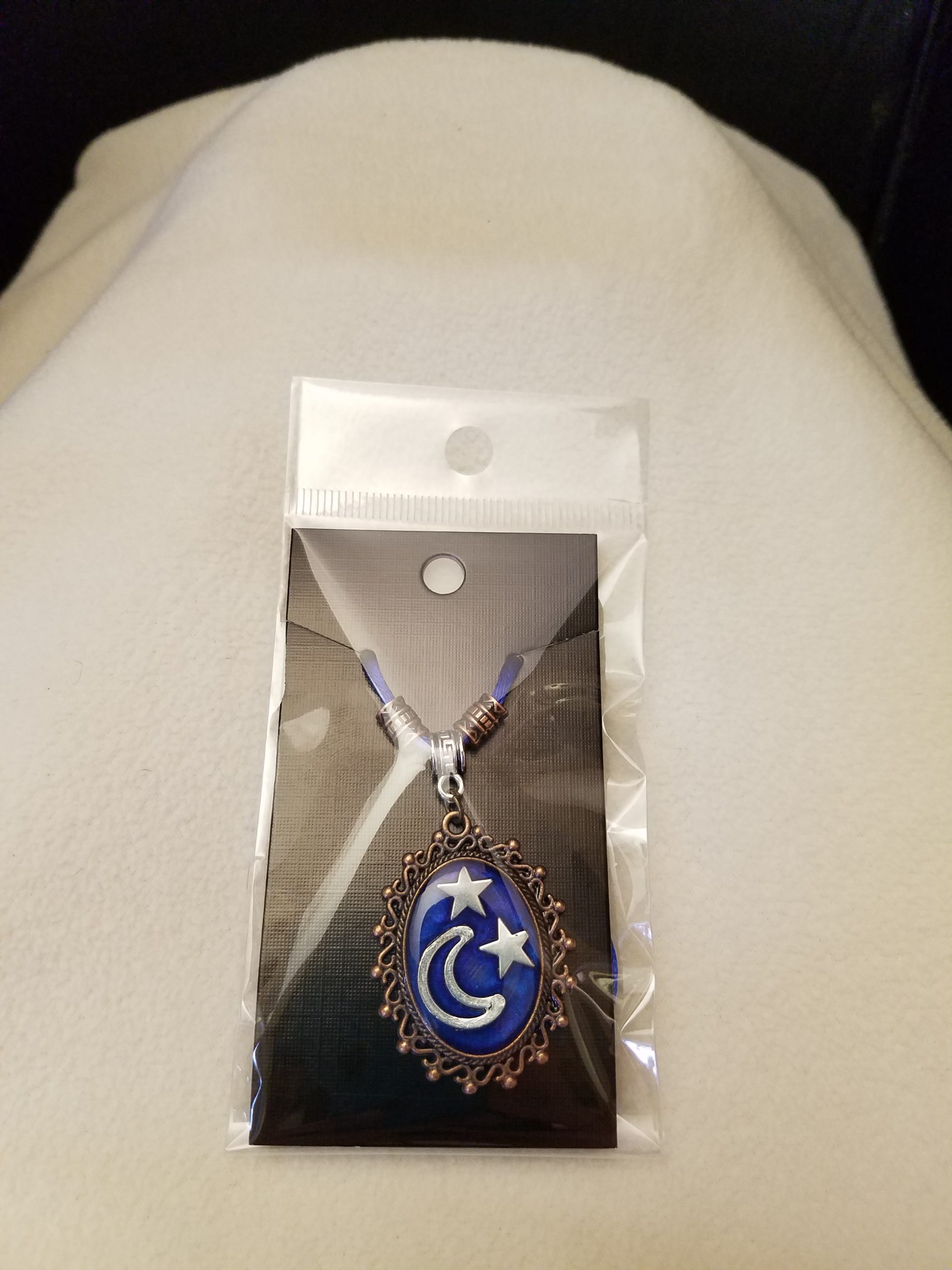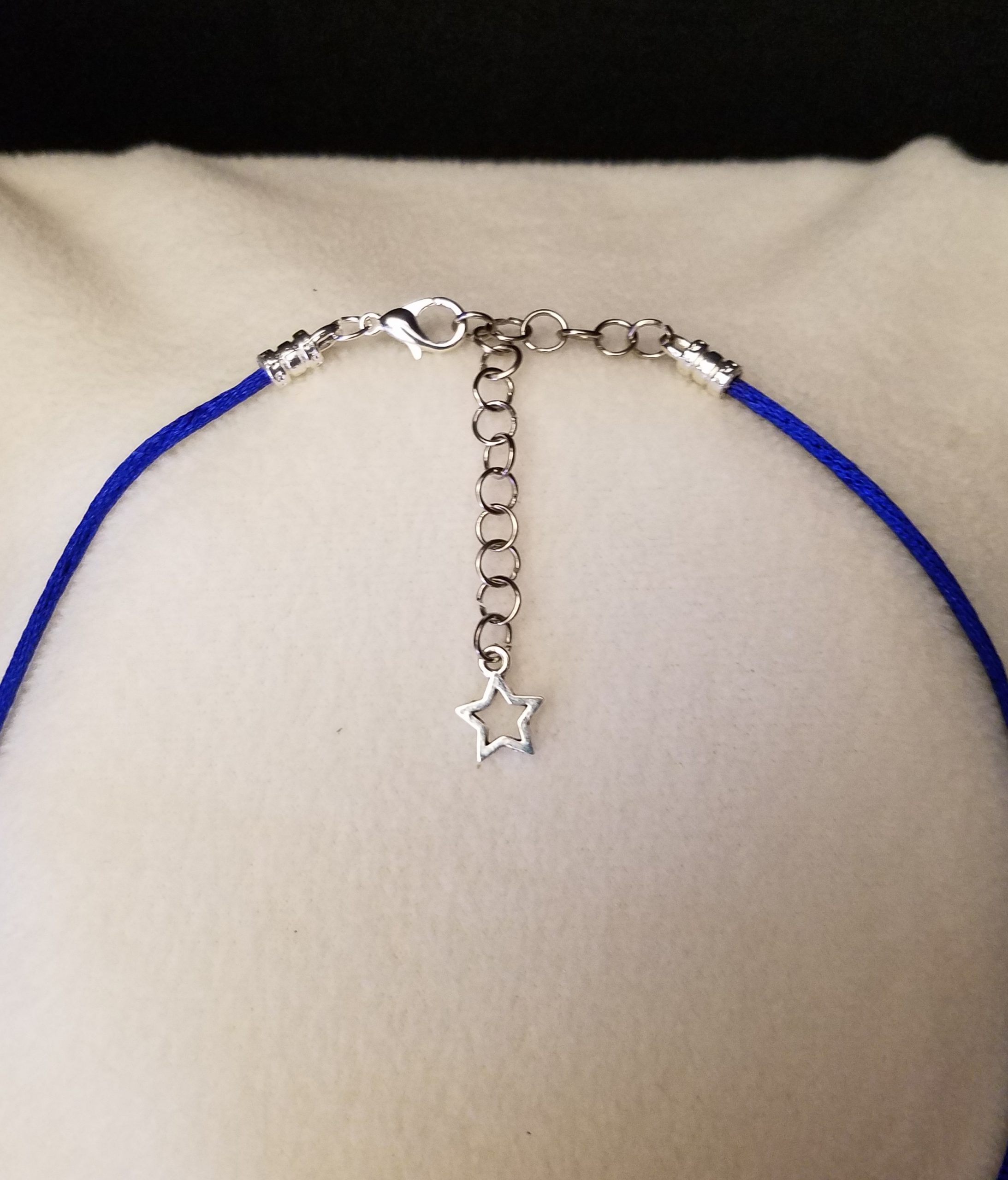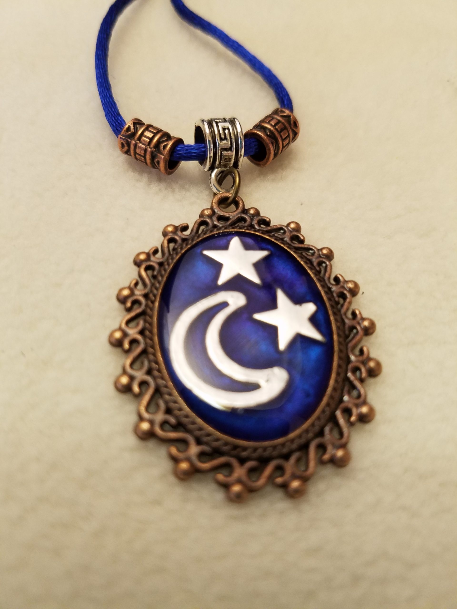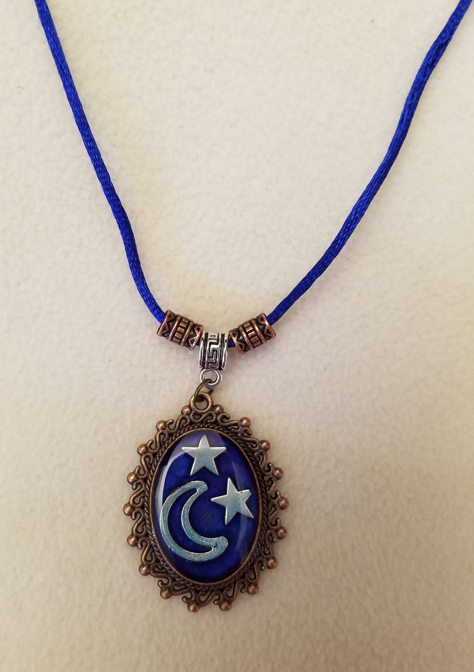 - A 20 1/2″ – 23″ blue cord necklace with bronze beads, a silver chain adjustment with a star counterweight and 1 1/2″ x 1 1/4″ decorative bronze pendant with silver moon and stars set in deep blue epoxy.