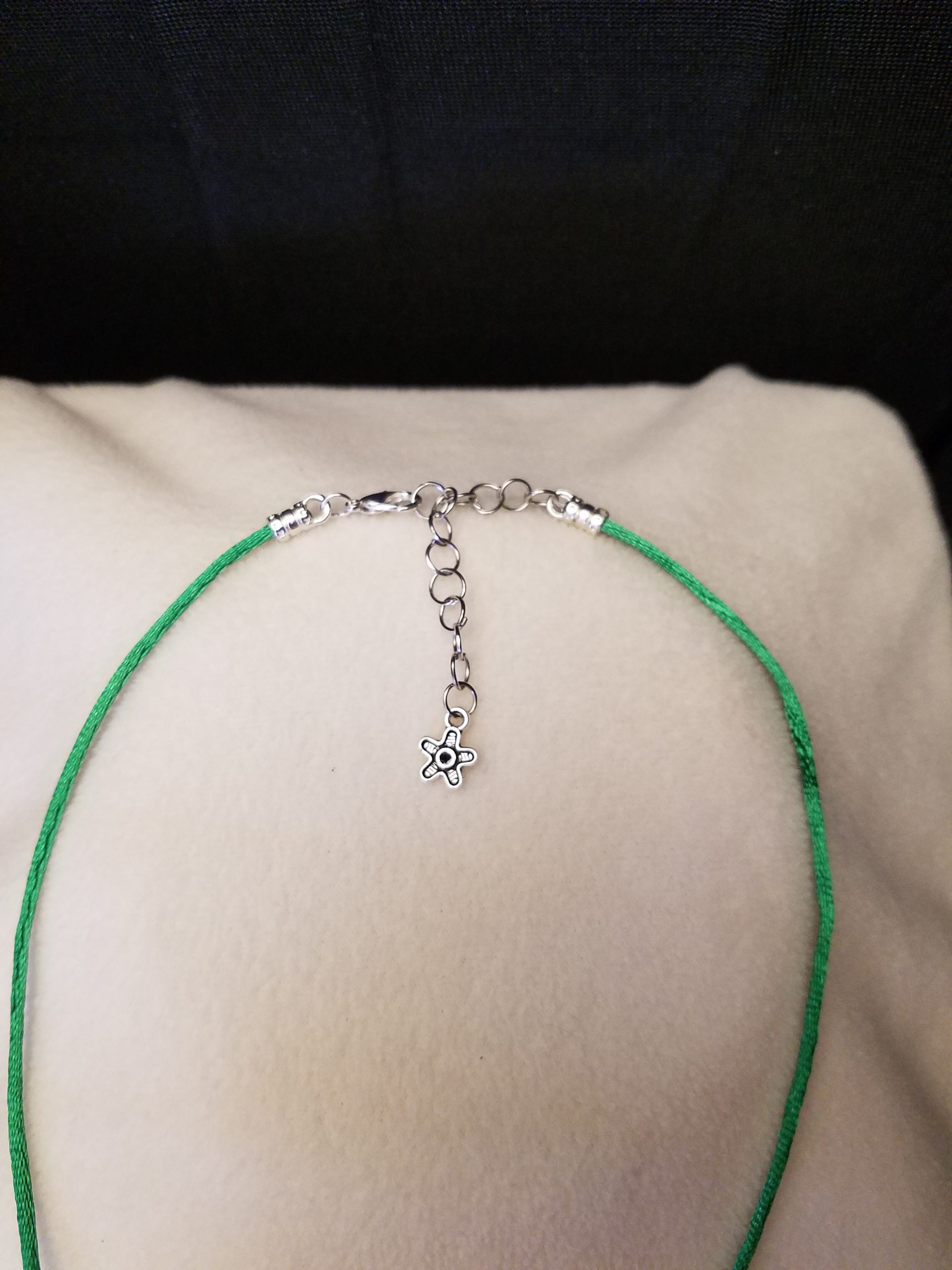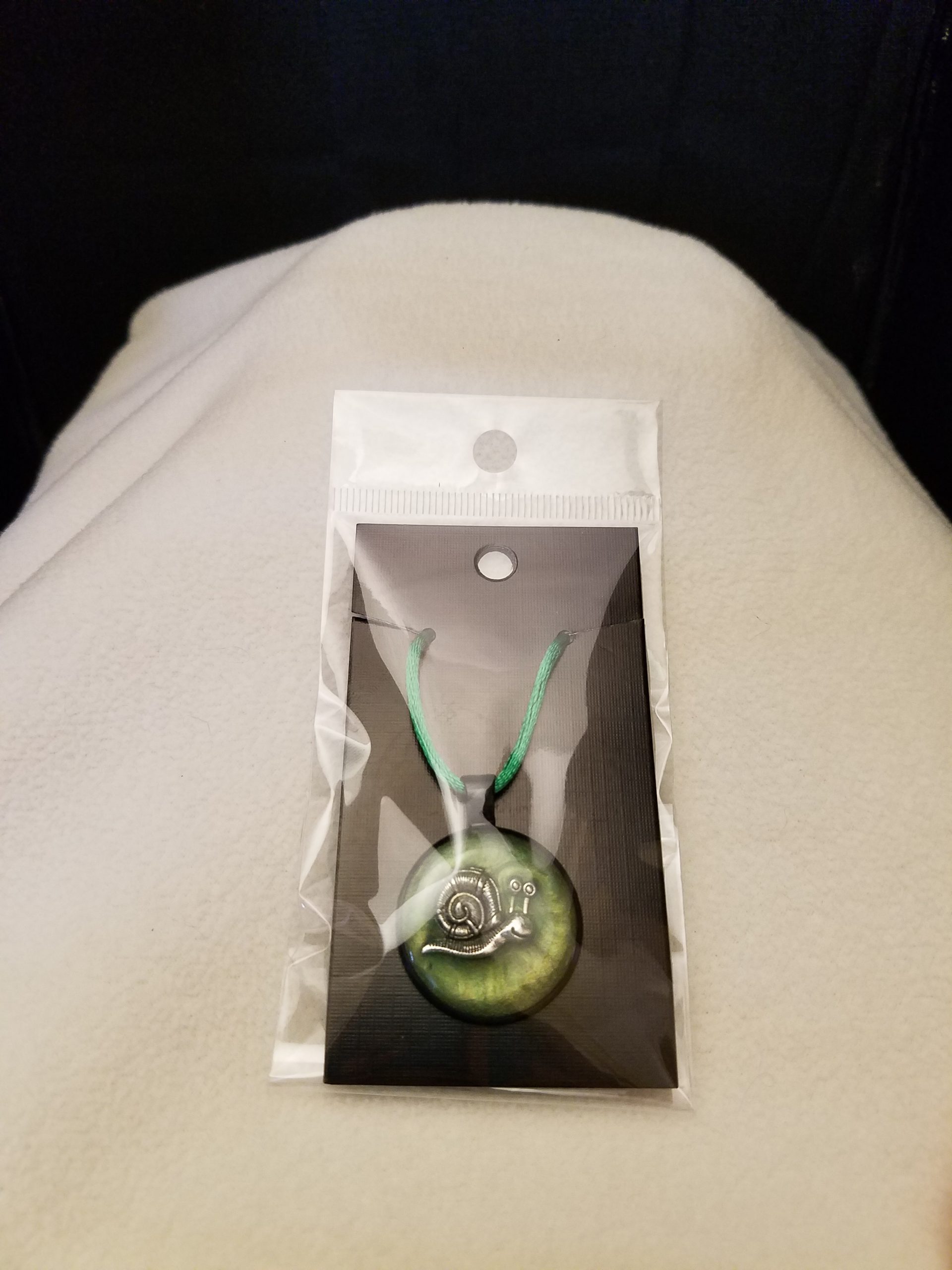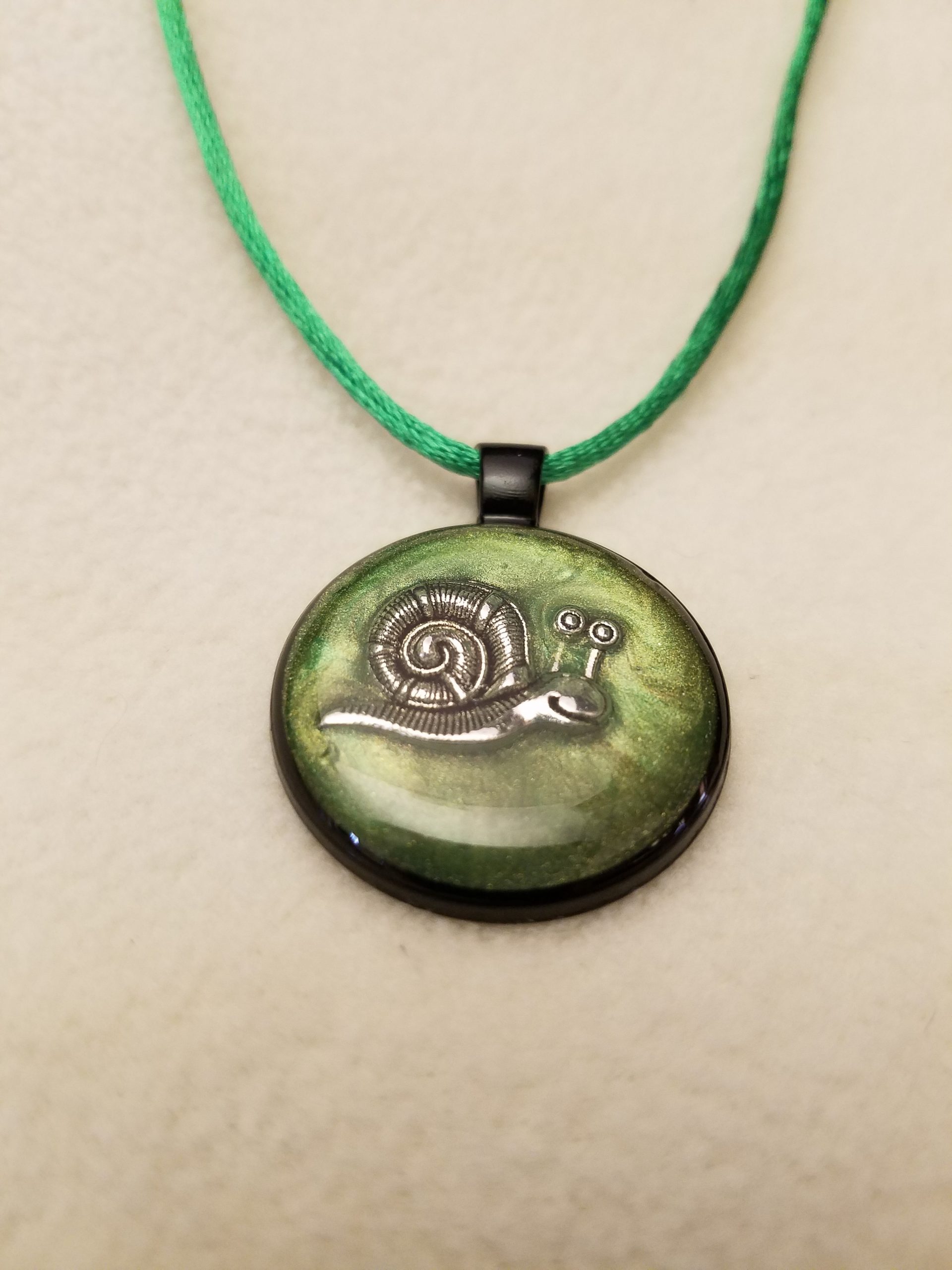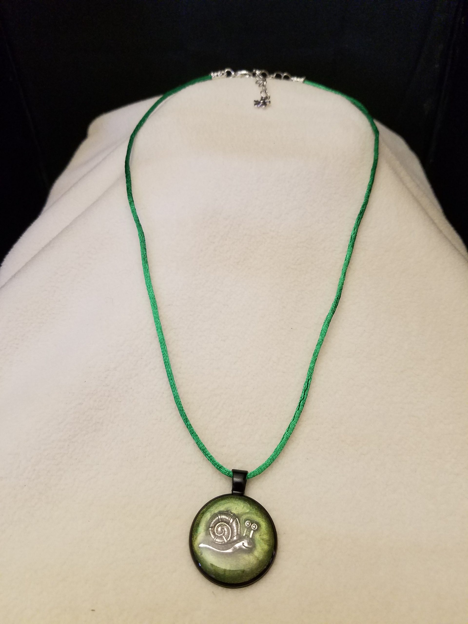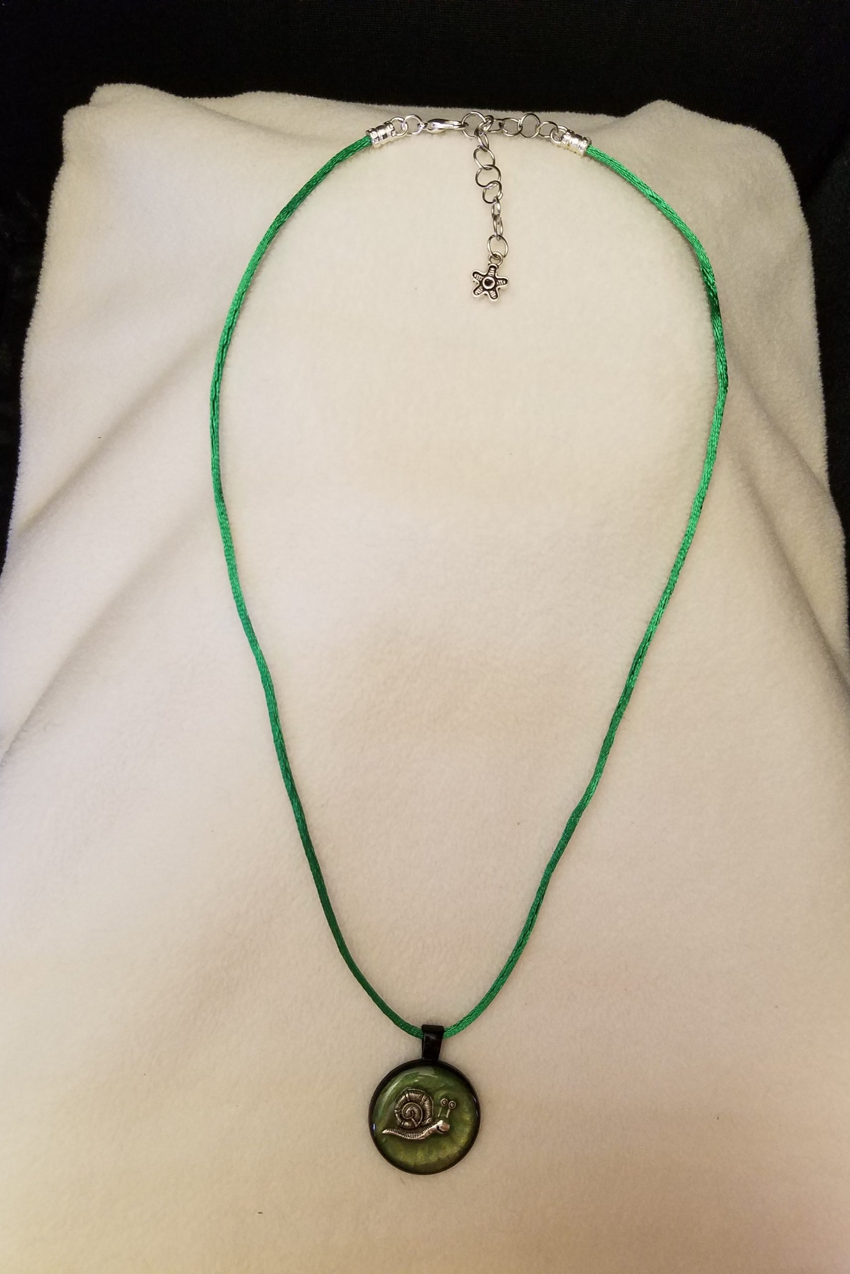 - A 20 1/2″ – 22 3/4″ adjustable green cord necklace with flower counterweight and a 1 3/8″ x 1″ round black pendant with a silver snail set in green epoxy.